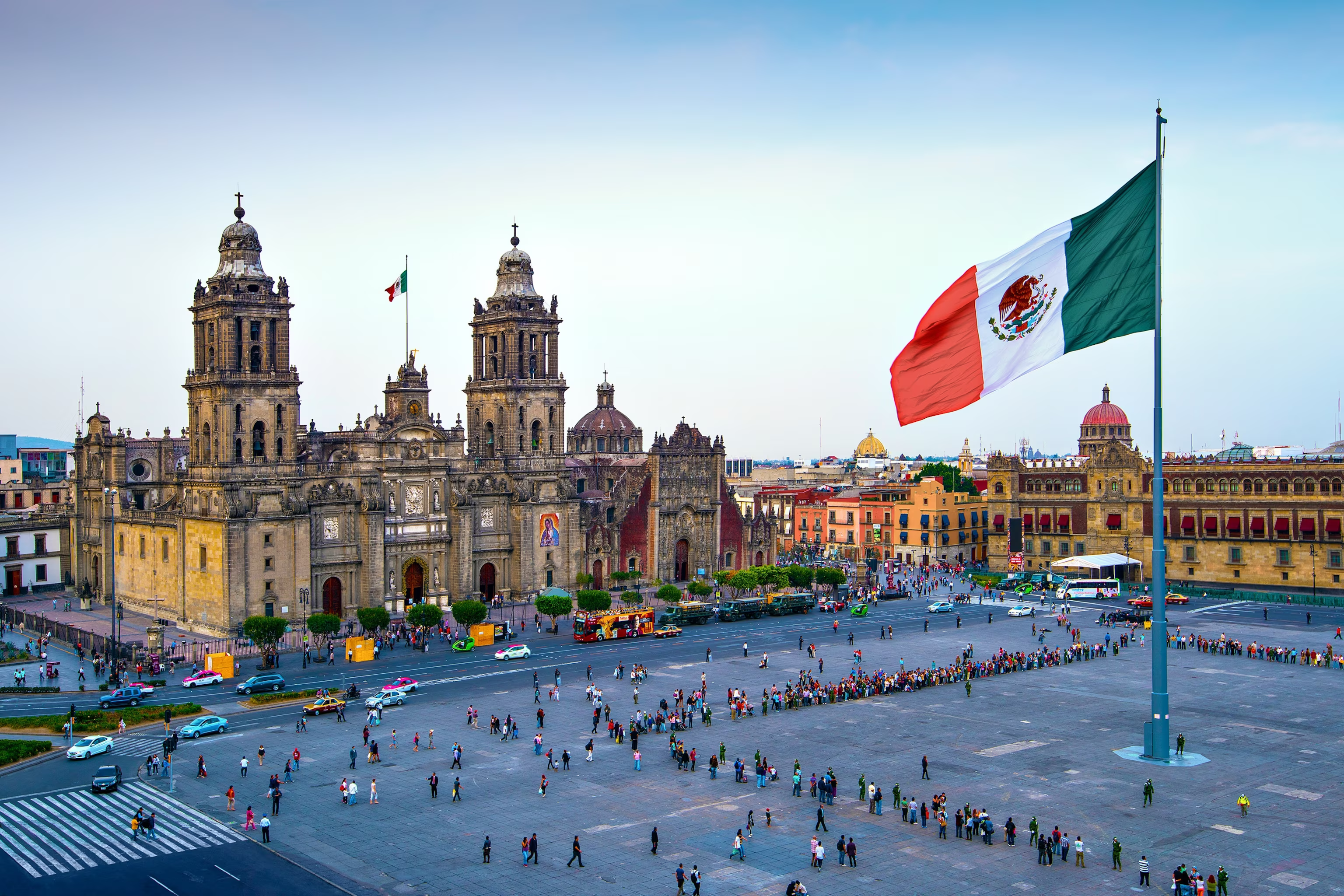 American breakfast in hotel and City Tour that includes: Plaza de la Constitución (The Constitution Plaza) known as Zócalo, surrounded by beautiful Baroque buildings, among which is the Cathedral (the country’s largest religious monument built over the great Aztec temple). The Palacio Nacional (National Palace) is the headquarter of the Presidency of Mexico, where visitors can admire murals painted by Diego Rivera. One of the main and most recently discovered attractions is the Templo Mayor, the great temple of the Aztec capital. Brief stop at the Guadalupe Shrine.